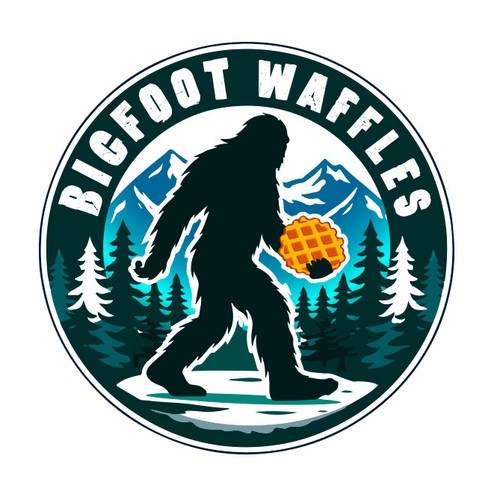 This is a logo for a food truck. We serve belgian sugar waffles. We want a logo with a bigfoot walking in front of a mou