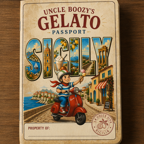 A passport-style print booklet for a 7–8-year-old boy to document and rate gelato across a one-week Sicily trip.
